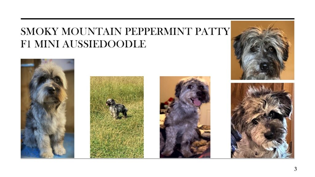Smoky Mountain Peppermint Patty F1 Mini Aussiedoodle Meet spunky little Peppermint Patty from our Smoky Mountain Sweets Litter! This little girl knows no fear and can definitely “run with the big dogs”! Patty is a Blue Merle, is 16″ tall and weighs 19 lbs.